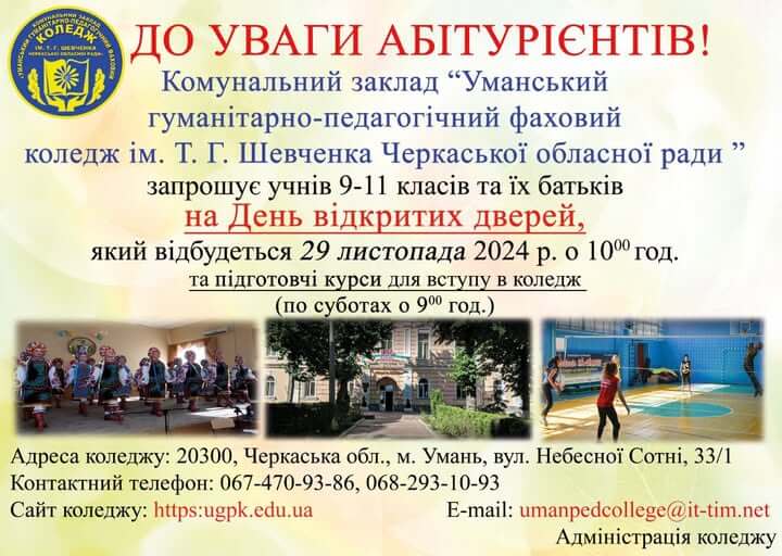 15 листопада 2024 р., Комунальний заклад «Уманський гуманітарно-педагогічний фаховий коледж ім. Т.Г. Шевченка Черкаської обласної ради» проводить благодійну акцію- ярмарок «І піснею. І словом наближаємо нашу ПЕРЕМОГУ». Сьогодні наш захід проводиться на підтримку Збройних Сил України, а саме на підтримку Читати далі …