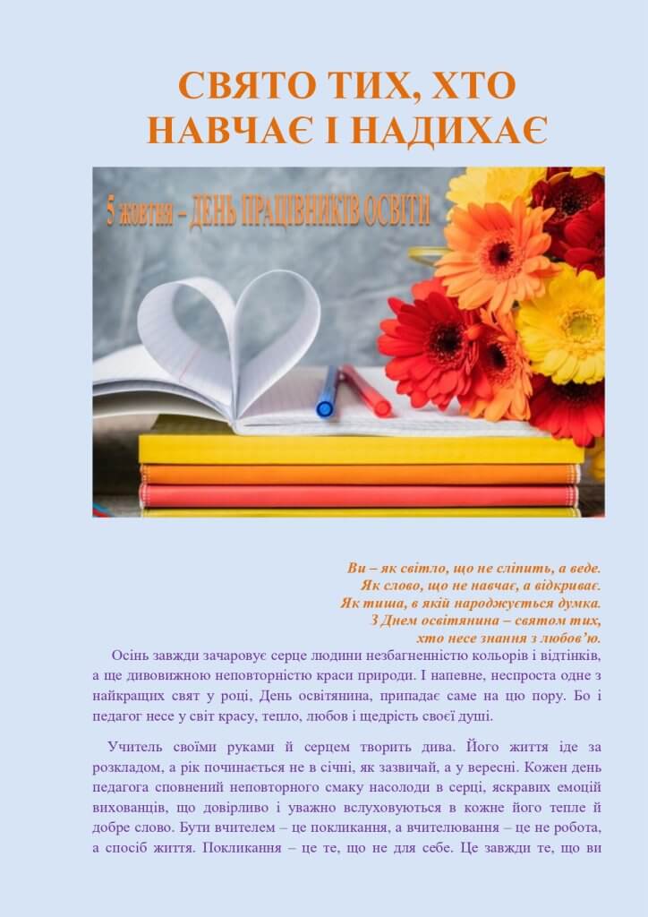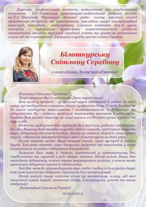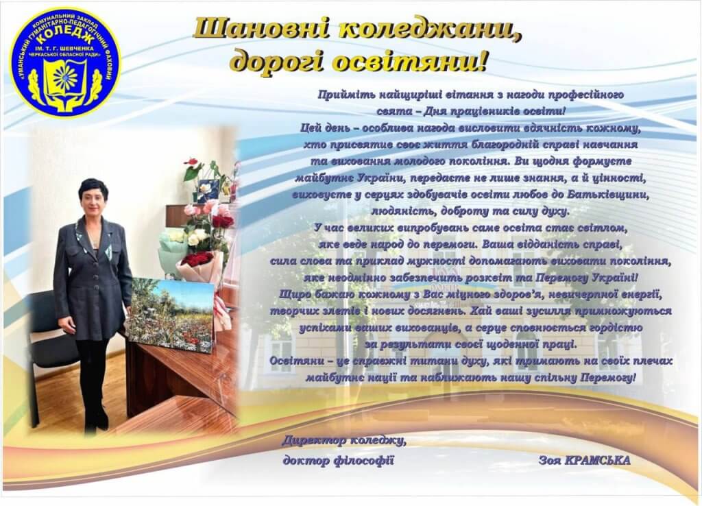 До Дня працівників освіти від КЗ «Уманський гуманітарно-педагогічний фаховий коледж ім. Т. Г. Шевченка Черкаської обласної ради». https://www.facebook.com/umanpedcollege/posts/pfbid02z6RVy3tcyt93iZ96eXw1T81rrtKSex6mpuMB9vNQzEqHAyAFPpXBwyfPUowuJrkVl