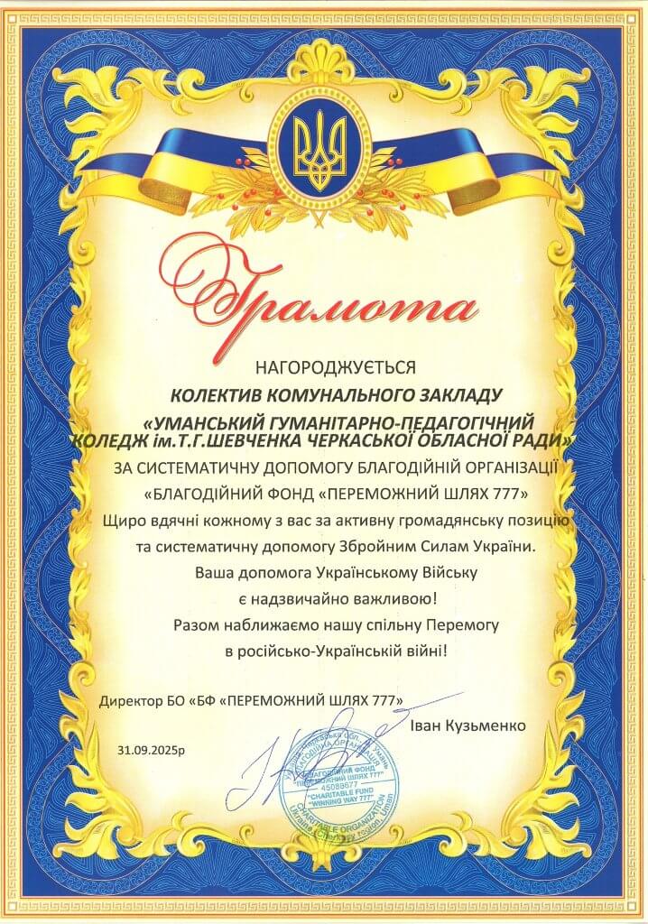 КЗ «Уманський гуманітарно-педагогічний фаховий коледж ім. Т. Г. Шевченка Черкаської обласної ради» https://www.facebook.com/reel/1765550657495565