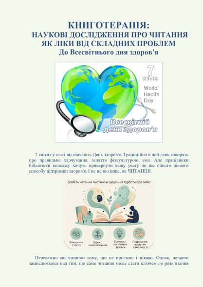 7 квітня у світі відзначають День здоров’я. Традиційно в цей день говорять про правильне харчування, заняття фізкультурою, сон. Але працівники бібліотеки коледжу хочуть привернути вашу увагу до ще одного дієвого способу підтримки здоров’я. І це не що інше, як ЧИТАННЯ. Читати далі …