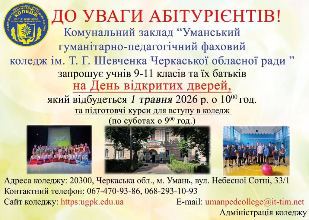 У передвеликодній період, у світлий день Чистого четверга, у нашому коледжі, комунальному закладі «Уманський гуманітарна- педагогічний фаховий коледж ім. Т. Г. Шевченка Черкаської обласної ради» панувала особлива атмосфера — атмосфера єдності, праці та добрих намірів. https://www.facebook.com/umanpedcollege/posts/pfbid02b3Ps3xNDEx6GF7Lp43ztNBvjTSqquMiuk9JZ1AgwDvW6hyT7u256nstQnDy8qnEUl
