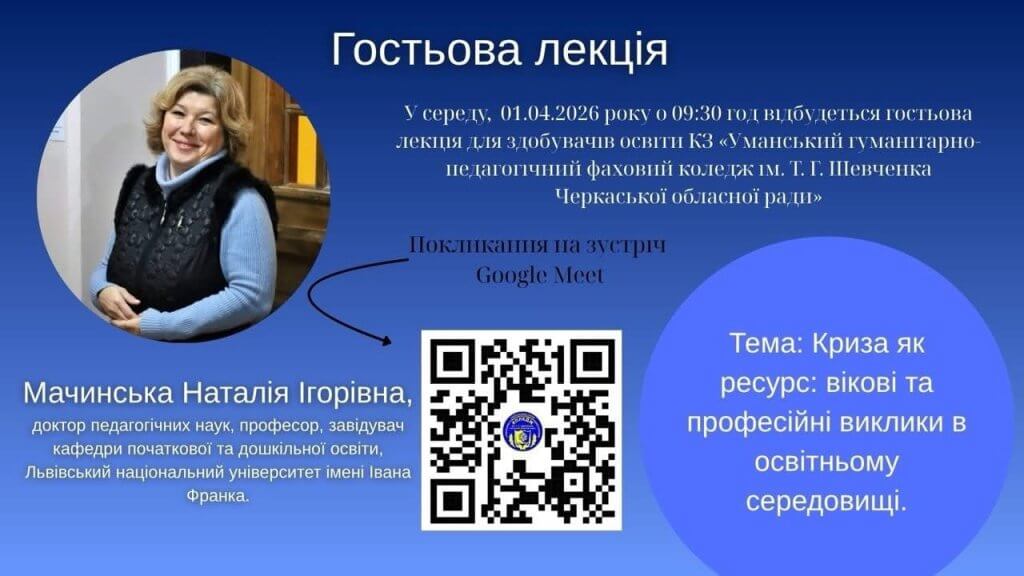 ГОСТЬОВА ЛЕКЦІЯ 1 Квітня, 202615 Квітня, 2026 Шимкова Юлія https://www.facebook.com/umanpedcollege/posts/pfbid02qsXv2AfB5eS5zZN13zZMyjwtWstwvrTQYet7nWcQqTZ6Q8krtDXbYQHxVPUQXVjyl