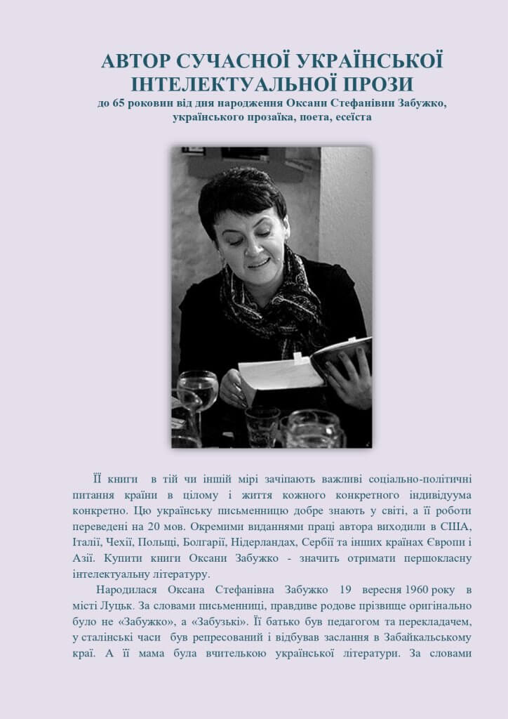 До 65 роковин від дня народження Оксани Стефанівни Забужко, українського прозаїка, поета, есеїста. ЇЇ книги  в тій чи іншій мірі зачіпають важливі соціально-політичні питання країни в цілому і життя кожного конкретного індивідуума конкретно. Цю українську письменницю добре знають у світі, а її роботи переведені на 20 мов. https://www.facebook.com/umanpedcollege/posts/pfbid02Vz2S5RTDMNaVpSpVMdk992rD6pbGRs8j6EzeSRJQUi3GjwSC4QbkynjUcDxtjcU7l