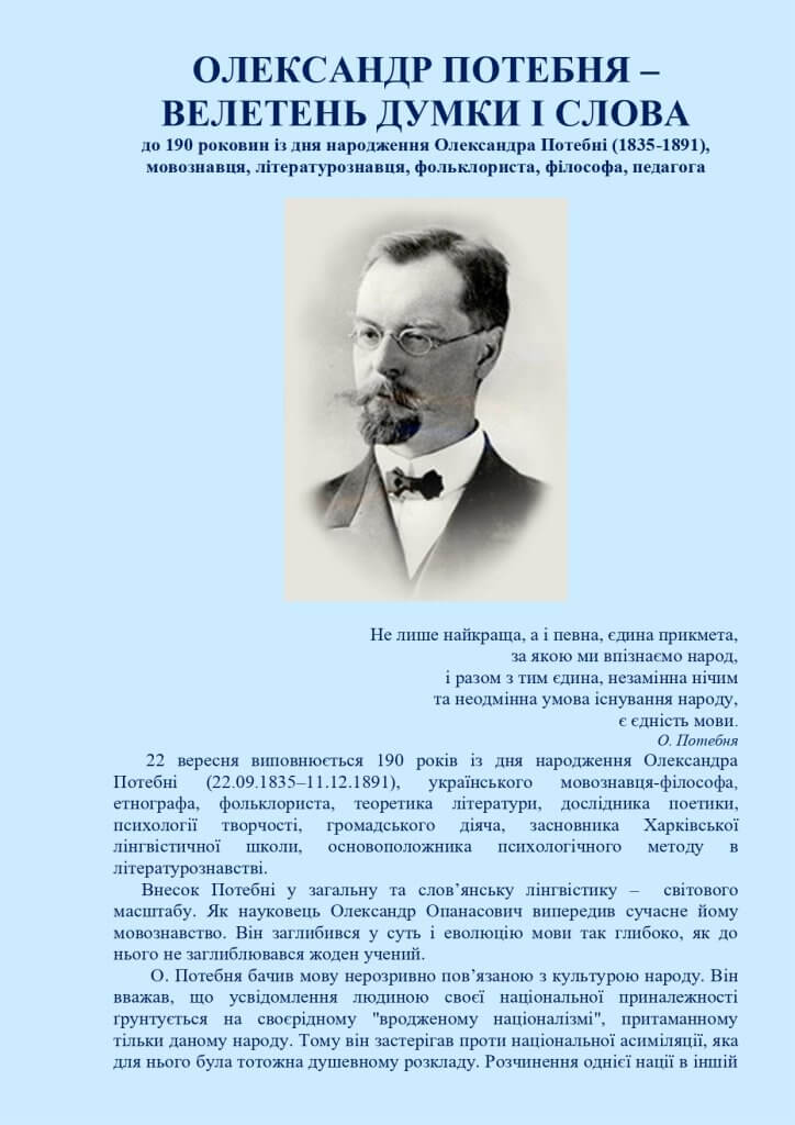 22 вересня виповнюється 190 років із дня народження Олександра Потебні (22.09.1835–11.12.1891), українського мовознавця-філософа, етнографа, фольклориста, теоретика літератури, дослідника поетики, психології творчості, громадського діяча, засновника Харківської лінгвістичної школи, основоположника психологічного методу в літературознавстві. https://www.facebook.com/umanpedcollege/posts/pfbid0njtR8BjnLrvtUrbattxizrub9VQUcLthK1rtLd71JGdvmwnb1nqse8ck3XFVPGJLl