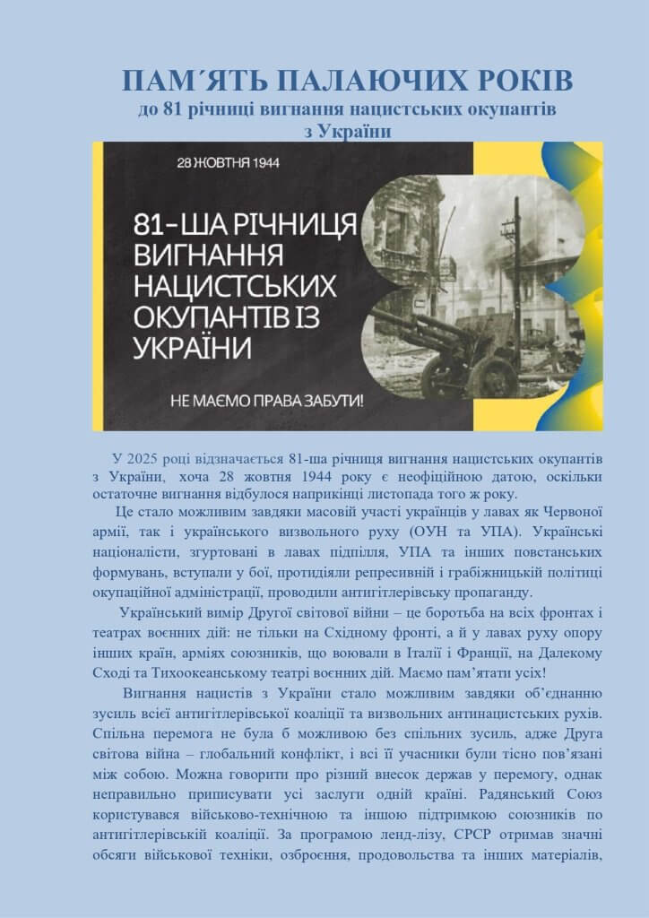 У 2025 році відзначається 81-ша річниця вигнання нацистських окупантів з України,  хоча 28 жовтня 1944 року є неофіційною датою, оскільки остаточне вигнання відбулося наприкінці листопада того ж року.