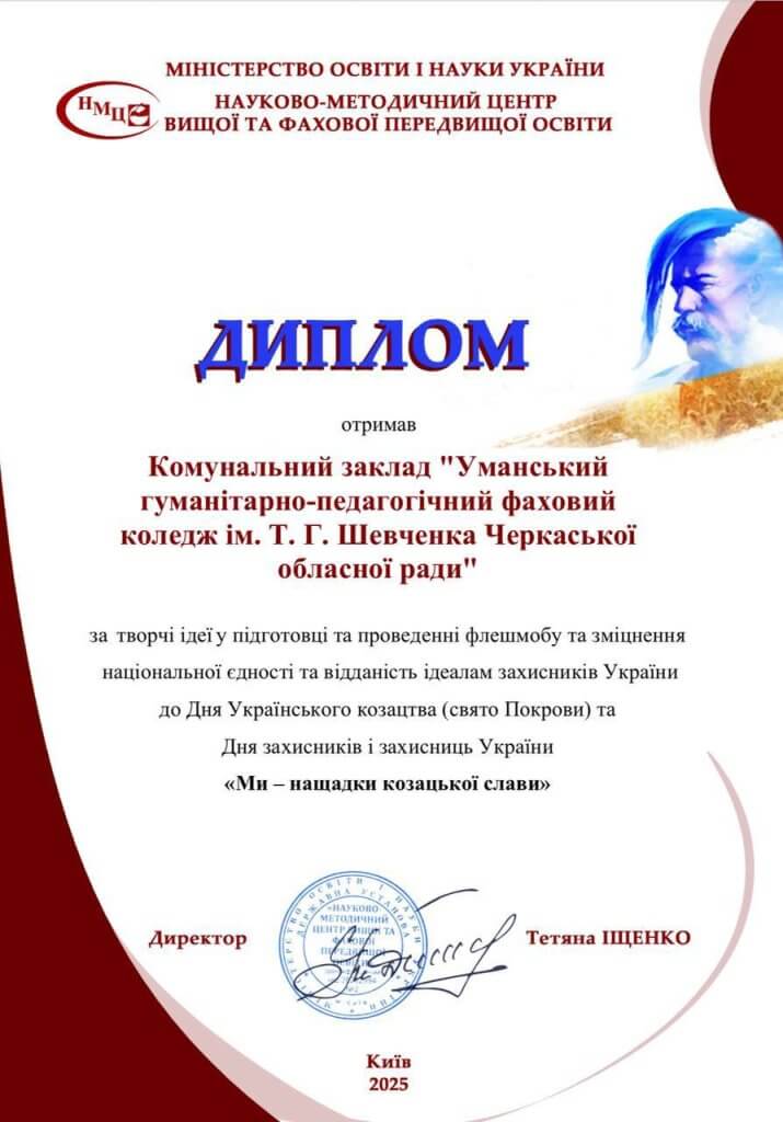Щиро дякуємо Державній установі «Науково-методичний центр вищої та фахової передвищої освіти» за високу оцінку роботи колективу КЗ «Уманський гуманітарно- педагогічний фаховий коледж ім. Т. Г. Шевченка Черкаської обласної ради». Разом ми робимо освіту кращою!